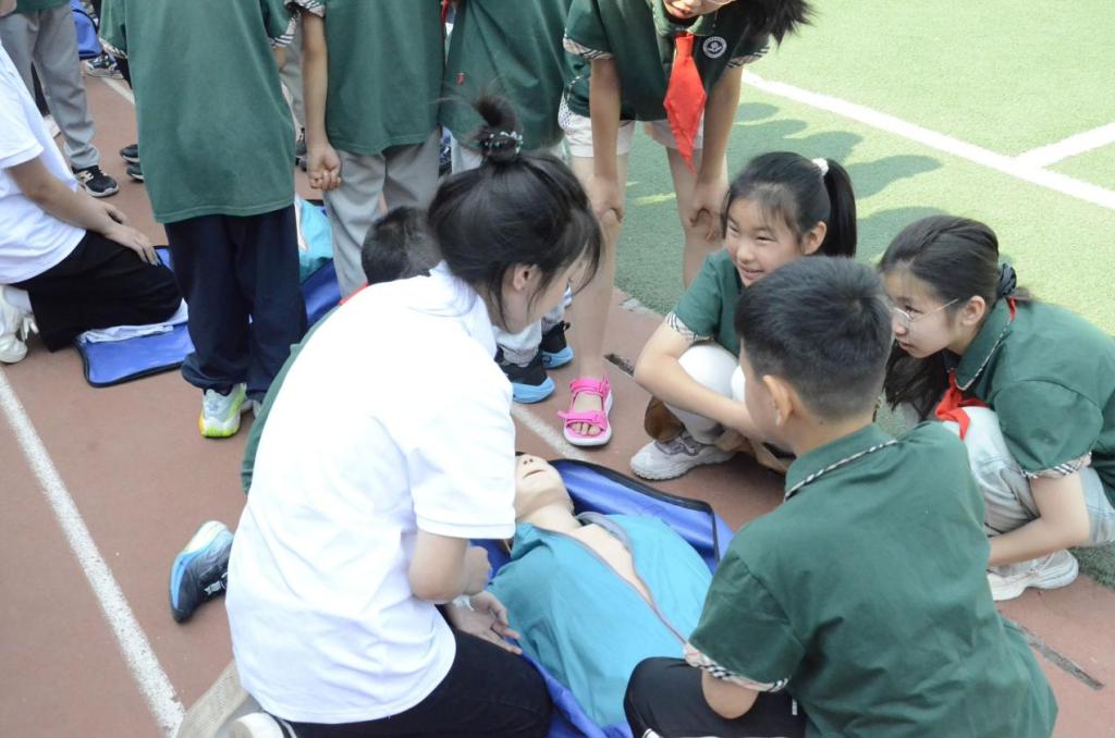 此次活动包括升旗仪式、志愿知识宣讲以及应急救护救培训三个部分。活动开始,Beat365官网国旗护卫队穿着整齐的制服,庄严地护送五星红旗走向升旗台,激昂的国歌声中,全校师生肃穆而立,目光追随着徐徐升起的国旗,爱国情怀在心底悄然升腾。在志愿宣讲环节,国旗知识宣讲员范智博以生动故事与问答互动的方式向小学生们讲解国旗与国徽的由来、国歌法与国旗法、爱国主义教育法,学生们踊跃参与,现场气氛热烈。消防安全知识宣讲员胡晓悦给同学们讲解火的两面性、消防用品的使用以及火灾逃生要点等知识,直观呈现火灾的危害与预防,让学生们深刻认识到消防安全的重要性。在应急救护实操培训中,志愿者借助人体模型,现场示范心肺复苏、海姆立克急救法等操作,同学们在志愿者指导下积极尝试,初步掌握基本急救技能。整个活动中,穿插的趣味小问答调动了孩子们的积极性,孩子们脸上洋溢着欢快的笑容与求知的渴望。