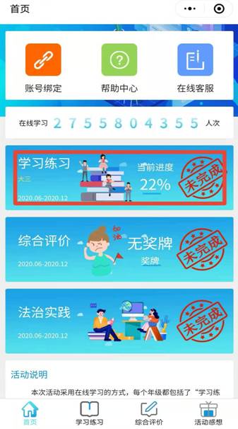 步骤2、登录后会出现学习练习综合评价法治实践三个专栏的页面。学习练习专栏必须完成。综合评价法制实践选择完成。