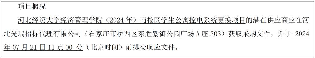 采购需求:河北经贸大学经济管理学院(2024年)南校区学生公寓控电系统更换项目全部内容(工程具体详见清单)。