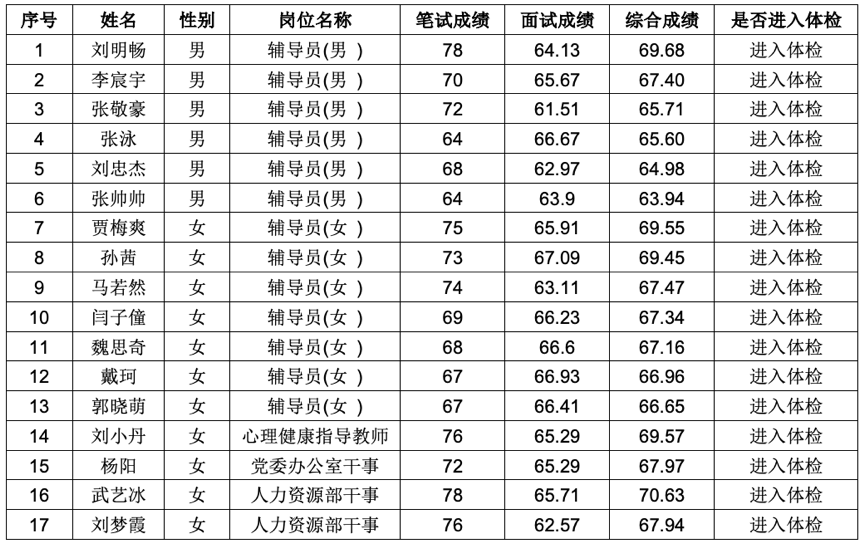 2024年7月28日,河北经贸大学经济管理学院2024年公开招聘工作人员的面试已结束。按照笔试、面试成绩均在合格分数线以上人员的总成绩确定体检名单,现将名单予以公布: