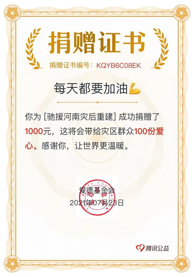 得到系里和学院领导支持后,任栢林代表该班,将900元班级奖励金和100元老师捐款一起汇到了腾讯公益爱德基金会,为帮助河南顺利渡过灾情贡献一份力量。