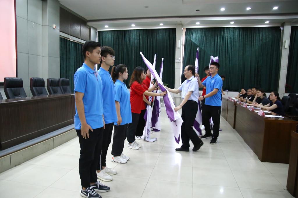马斌宣布学院2021年暑期社会实践活动正式开始,并为各社会实践小分队授主题旗。