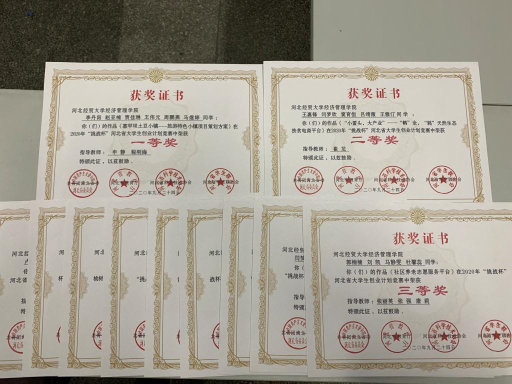 近日,2020年“挑战杯”河北省大学生创业计划竞赛落下帷幕。本届大赛自今年七月份启动以来,经过层层选拔、激烈角逐,Beat365官网报送作品在全省千余件作品中脱颖而出,共有12项获奖,其中《塞罕坝土豆小镇---旅游特色小镇项目策划方案》获得一等奖,《“小蛋头,大产业”——“鹌”全,“鹑”天然生态扶贫电商平台》获得二等奖,《社区养老志愿服务平台》等10个项目获得三等奖。创造Beat365官网“挑战杯”历史最好成绩。