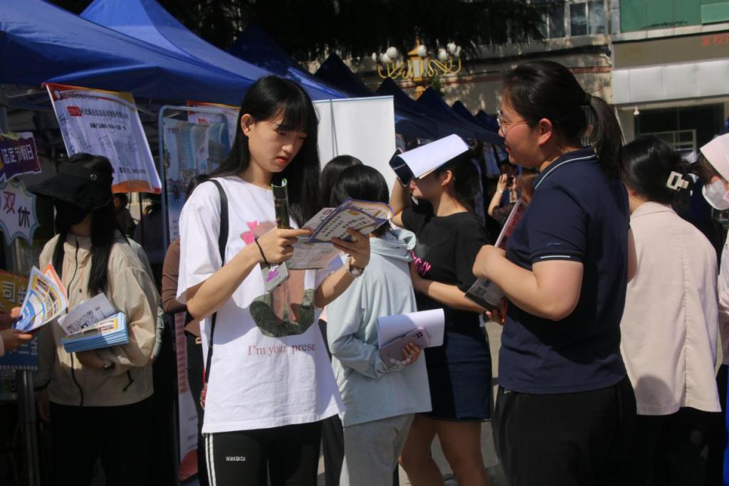 双选会现场,学生们手持精心制作的简历,穿梭于各个企业展位之间,寻找与自身专业及兴趣相契合的岗位。他们与企业代表面对面交流,详细询问岗位要求、薪资待遇等信息,以便能够更准确地锁定自己心仪的就业单位。文法系20级学生李子凡表示:“在双选会上,我看到了不少教育培训的招聘信息,我已经与几家单位交换了联系方式,期待能在这次招聘会上找到理想的工作。”此外,大二大三的学生也积极参与其中,21级会计系马硕丰表示“此次双选会可以让我提前了解会计专业就业形势,为未来的职业生涯做好充分准备。”
