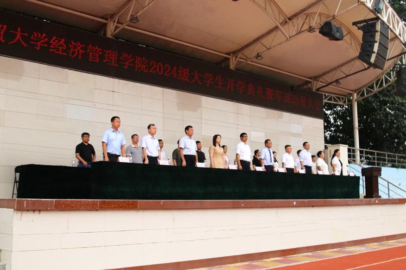 伴着雄壮的国歌声,全场肃立向国旗,典礼正式开始。院长刘风长致辞,他首先对学生们的到来表示最热烈的欢迎,并向辛勤耕耘的师长及默默支持的家长们致以崇高的敬意。随后,他向“新经管人”提出了三点期望:要立德为先,在胸怀家国中勇担使命,科学制订大学生涯规划,明晰奋斗目标,将个人追求编织进国家高质量发展的经纬之中;其次要励学为本,在笃行不怠中涵养学识,加强自我管理,打牢专业基础,善于思考创新,不断提升独立分析问题和解决问题的能力;三是力行为要,在躬身实践中锤炼本领,要主动走进工业园区、田间地头,了解现实世界,体悟社情民意,在投身中国式现代化建设的火热实践中成就自己的事业与梦想,努力成为新时代的见证者开创者、建设者。