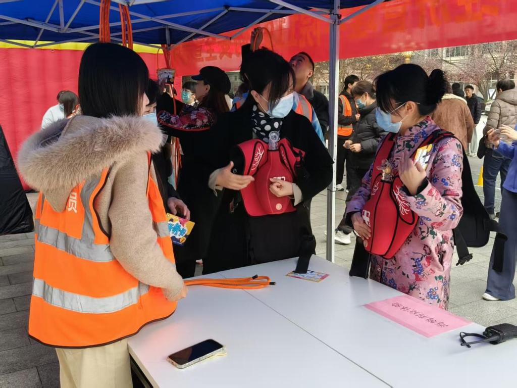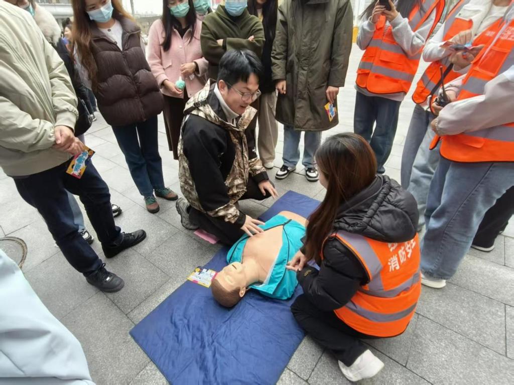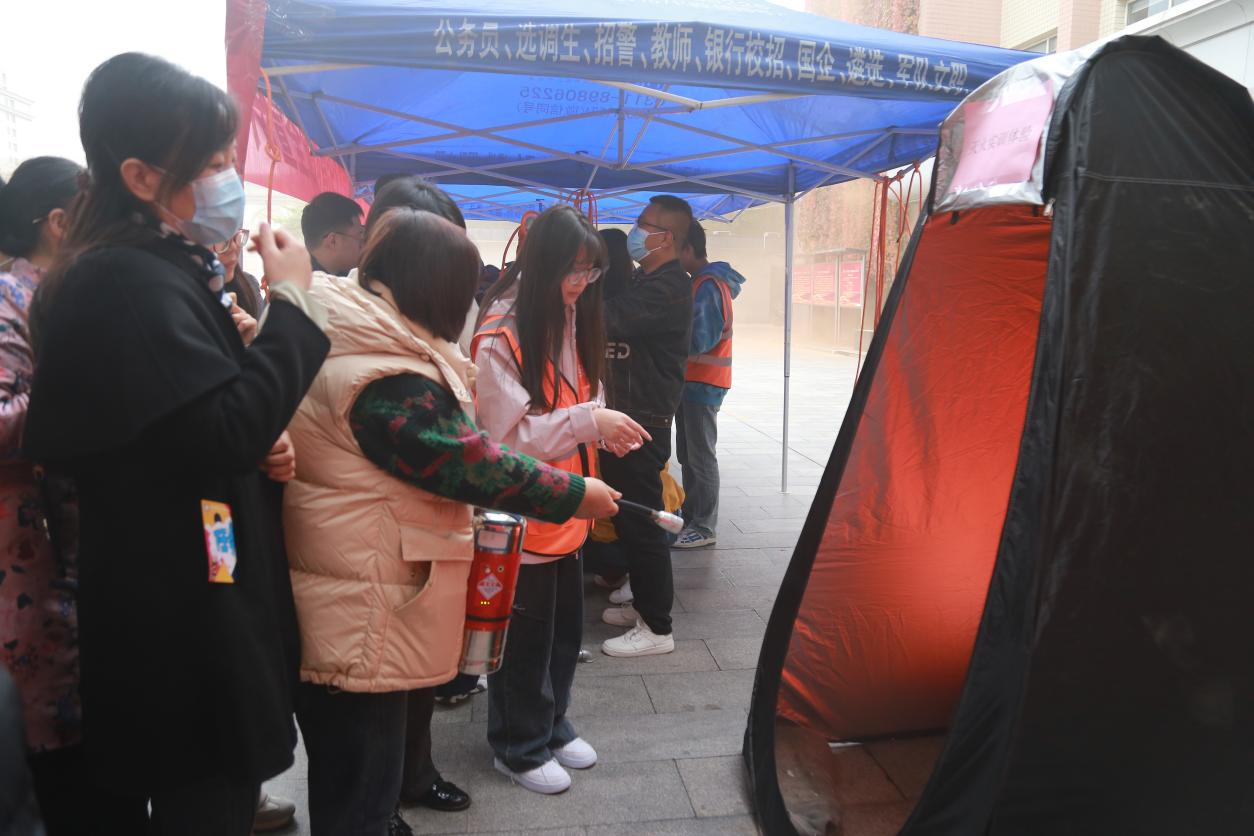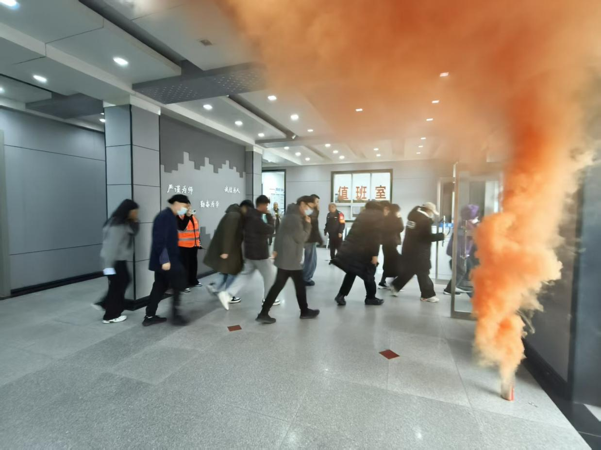 活动以“理论+实操+体验”的形式展开,核心环节包括教职工疏散演习与多项消防技能体验。疏散演习以办公楼为场景,通过警报、烟雾弹模拟真实火场环境。安全员提前明确分工,演习启动后,警铃大作,各区域负责人同步开启疏散门、投放烟雾弹,引导教职工以“湿物捂口鼻、低姿靠墙行”的规范动作有序撤离,全程高效且秩序井然。消防技能体验区,教职工老师在志愿者的指导下参与烟雾逃生帐篷体验、模拟灭火实训、结绳逃生教学、海姆立克急救演练、醉酒行走体验、心肺复苏实操及消防知识转盘问答等项目,从火场逃生、初期灭火到急救技能、安全认知,全方位补齐消防知识薄弱点。