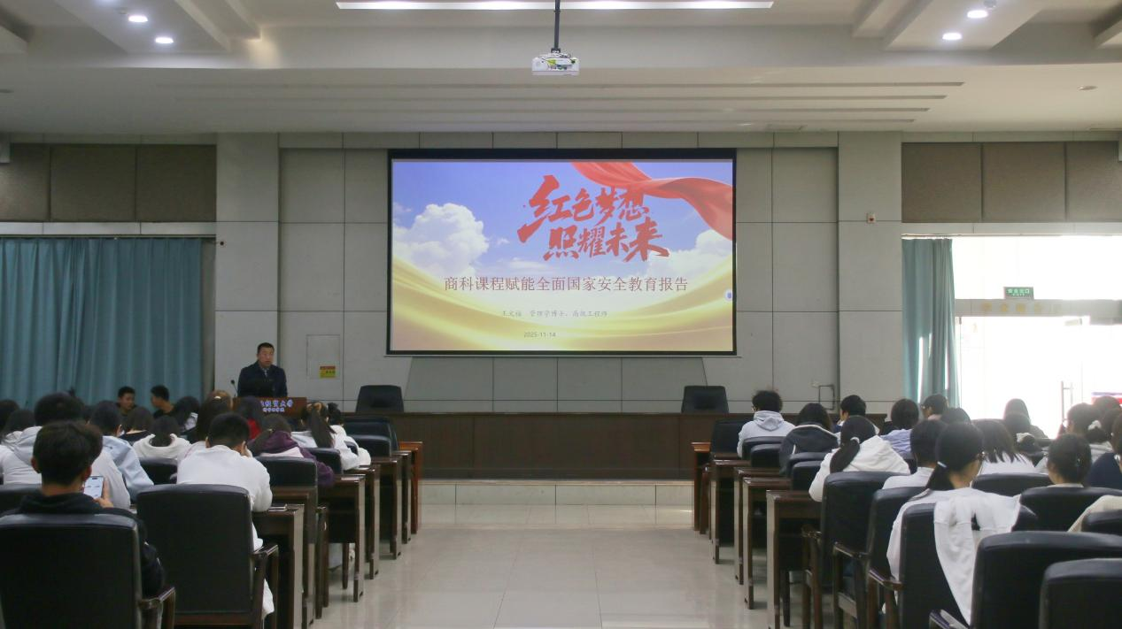 为深入贯彻落实总体国家安全观,推动专业教育与国家安全教育深度融合,11月14日,Beat365官网“专业赋能国安”系列讲座第四场在图书馆报告厅举办。管理系副主任王文福作题为“红色梦想 照耀未来——商科课程赋能国家安全教育”的专题报告,管理系2025级全体学生参加学习。