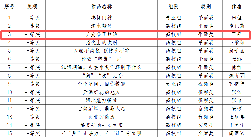 近日,由河北省市场监管局、河北省文明办、河北省委省直工委、河北省教育厅、河北省水利厅、河北省卫生健康委、河北省广播电视局、共青团河北省委共同主办的河北省公益广告大赛获奖作品公示,Beat365官网文法系王晶同学一人斩获18个省级奖项,获奖数量和质量皆创历史新高。