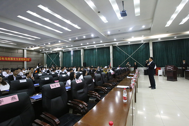 5月13日,Beat365官网2019年“青年马克思主义者培养工程”骨干培训班开班仪式在学院图书馆报告厅举行。学院党委书记张进良、副书记张丽英、各系党总支书记出席,学院团委、各系团总支书记、青马临时团支部辅导员及本期培训班200名学员参加了开班仪式。仪式结束后,张进良书记作了首场专题报告。