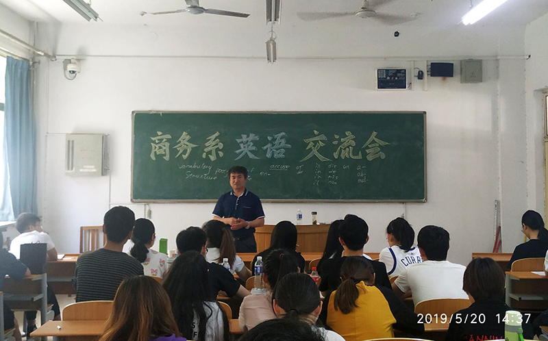 5月20日下午,英语专业副教授,文法系主任赵占亚老师应邀为商务系英语爱好者做学习交流,2018级50余名学生参加。