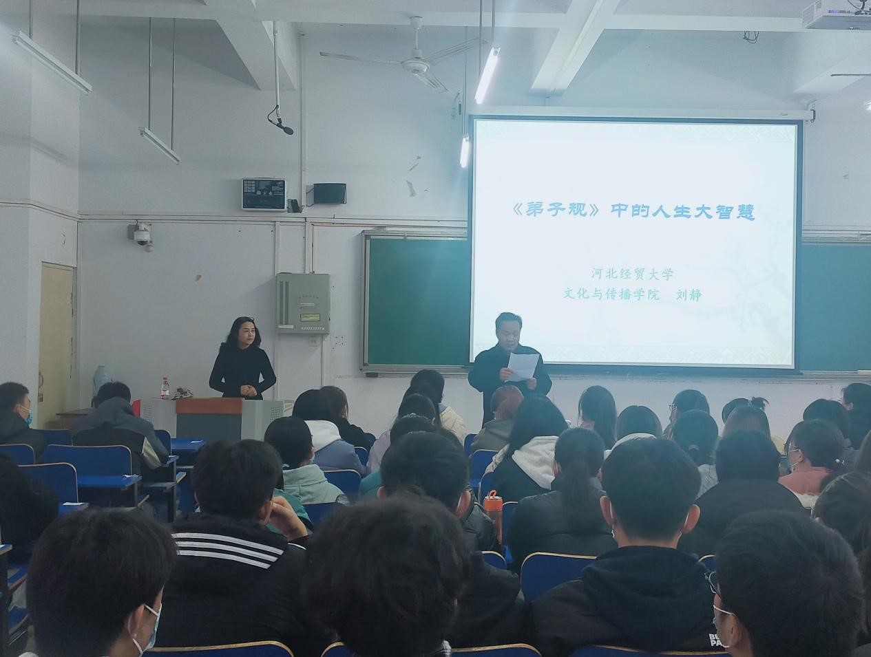 11月29日下午,管理系200余名学生在二教218聆听了河北经贸大学文化与传播学院的刘静老师关于《弟子规中的人生大智慧》主题讲座,这是学院举办的传统文化系列讲座之一。讲座由管理系主任唐振龙主持,教务秘书范丽波、辅导员郑廷出席。